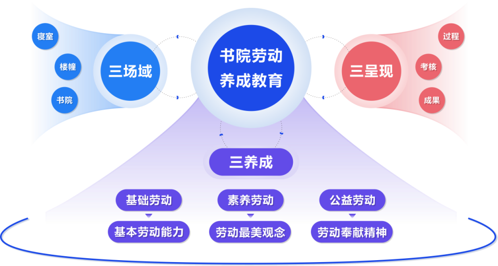 书院劳动养成教育具体从寝室、楼幢和书院三个场域开展。寝室主要开展基础劳动养成教育,以养成良好劳动习惯,包括寝室卫生自我管理、内务自我整理和安全自我管理等,由寝室长负责组织管理;楼幢主要开展素养劳动养成教育,以树立劳动最美观念,包括书院楼幢美化、公共卫生管理、书法进书院和劳动文化宣传等,由书院学生组织负责组织管理;书院主要开展公益劳动养成教育,以培养劳动奉献精神,包括参加志愿服务、书院治安活动、地方服务和朋辈互助等,主要以书院组织志愿者参加公益劳动养成教育,由书院辅导员负责组织管理。