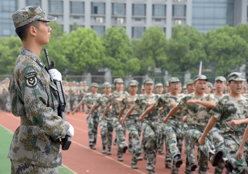 “同学们好!”“同学们辛苦了!”汪俊昌在赵灵刚的陪同下检阅方阵。学生们英姿飒爽、精神抖擞,“老师好!”“为学校争光!”声音震彻沙场,顿显军人风范。检阅式结束后,69个连队进行了精彩的分列式表演。在雄壮的《奏分列式进行曲》中,各个连队分别沿着阅兵道正步经过观礼台。全体参训学生器宇轩昂,身姿挺拔,队列整齐,步履有力,精彩表现赢得阵阵掌声。