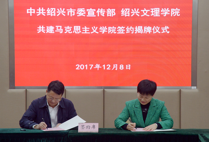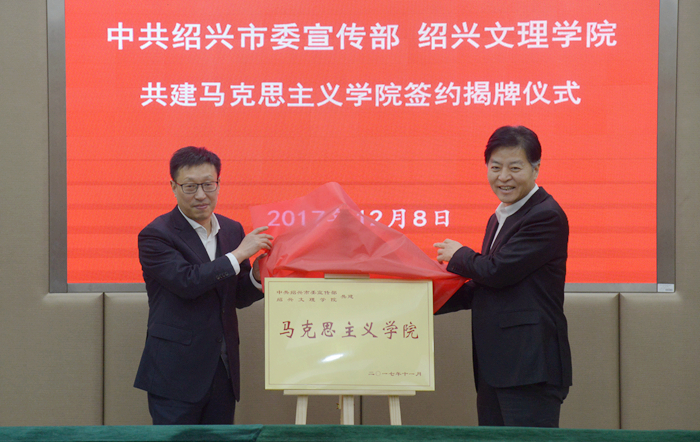 12月8日下午,中共绍兴市委宣传部与我校共建马克思主义学院签约揭牌仪式在铁城科教馆一楼会议室举行。市委宣传部常务副部长何俊杰、校党委书记汪俊昌为“部校共建马克思主义学院”揭牌,市委宣传部副部长黄伟英、校党委副书记沈赤代表共建双方签署“部校共建协议”。