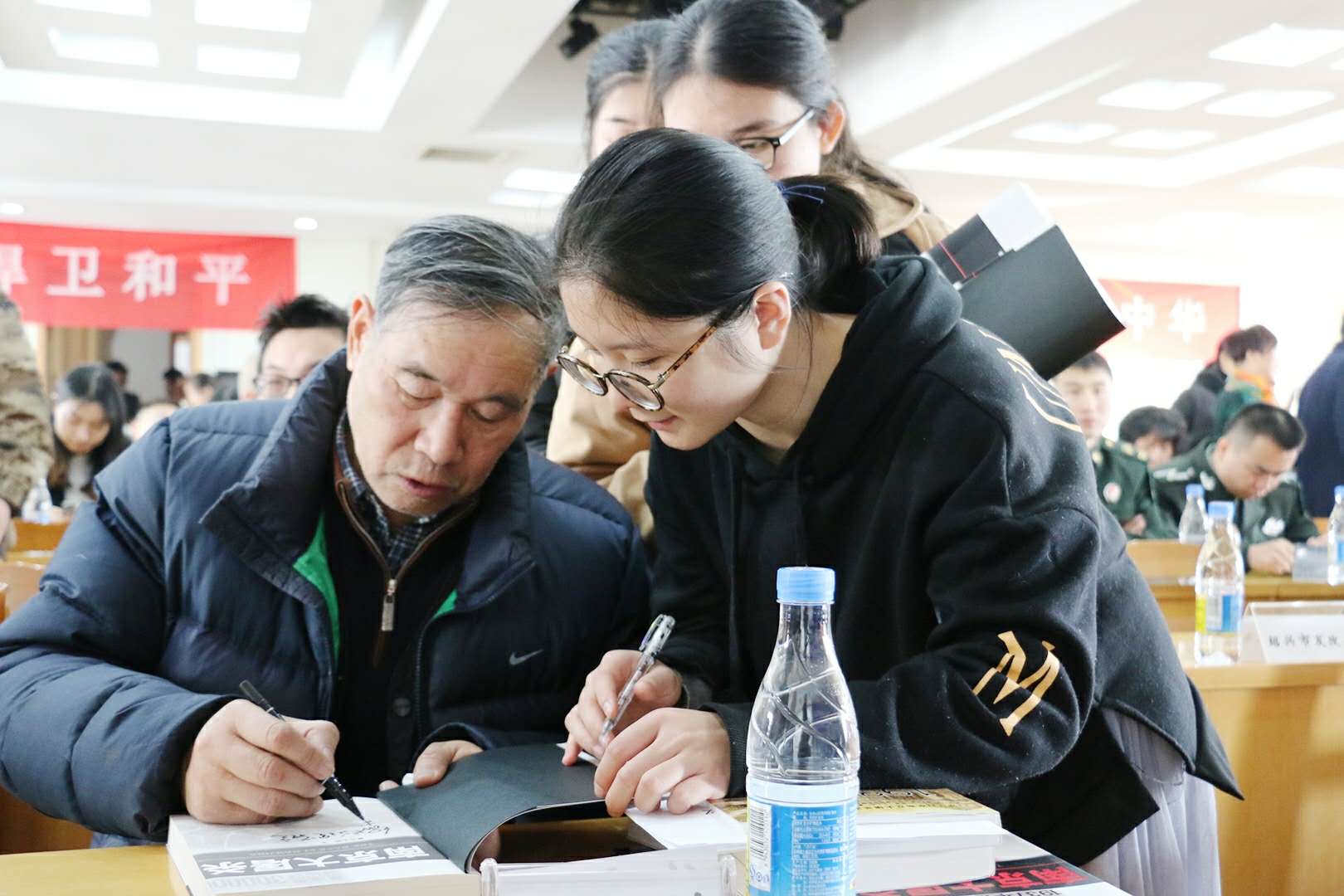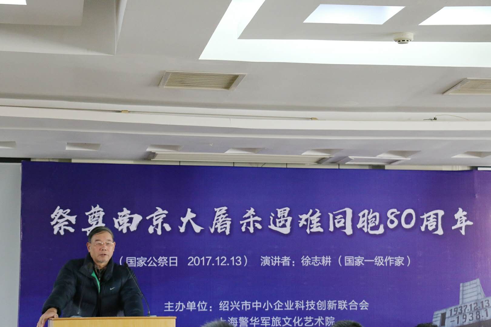 在纪念活动上,绍兴籍国家一级作家徐志耕老师带着他再版发行的《南京大屠杀》一书,给大家带来了一场精彩的专题讲座。这部被称为史书式的报告文学,记录了民族苦难的一个缩影,记述着人类历史上一场举世震惊的大悲剧。1987年12月第一次发行时就被读者蜂拥争购,出版当月就发行15万册。已经71岁高龄的徐老用“巍巍金陵,滔滔大江,钟山花雨,千秋芬芳。一九三七,祸从天降,一二一三,古城沦丧”作为开场,讲述了他从1985年萌发写南京大屠杀的冲动,几经周折、辗转多地,寻访南京大屠杀的1740多名幸存者,最后用大量生动的事实,用报告文学的方式,写成了这部“第一次全面、真实、深刻而形象地描述`南京大屠杀´的始末,揭露侵华日军的血腥暴行,揭示造成这一悲剧的种种缘由”的作品的过程。