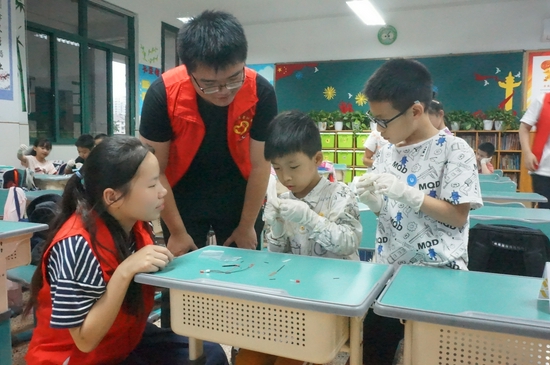 大学生志愿者们引领着孩子们研究“水果电池”。老师们从生活中的能源出发,进而介绍让水果电池发光的原理,手把手地教孩子们动手实践,利用水果中的果酸与正负两极的铜片与锌片反应产生电流并点亮二极管。孩子们渴求知识的眼神,动手操作的专注,取得成功的欢笑都是课堂上最美的风景。