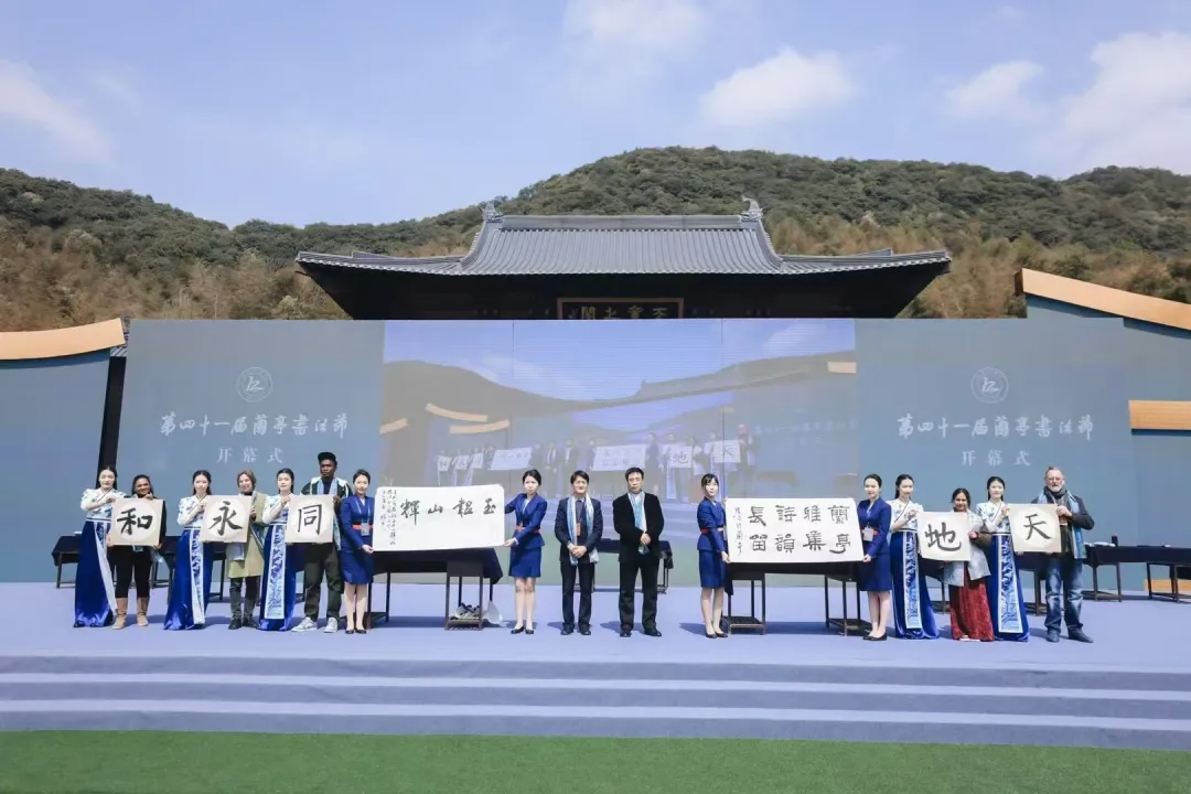 在开笔仪式环节,中国书法家协会副主席张继、张胜伟和来自五大洲的书法爱好者代表共同为本届书法节开笔。张继写下“兰亭雅集 诗韵长留”,张胜伟“玉韫山辉”,五位代表共同写下“天地同永和”。