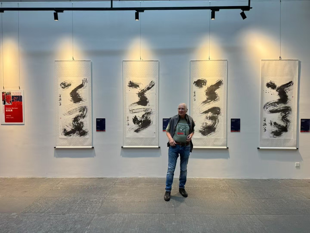 在瑞士“兰亭书法学堂”10周年书法展遇见Nicolas Murisier(岩安澜),他正站在自己的大幅书法作品《鸿飞兽骇》前拍照留念。行云流水的四字草书,宛如笔下生风。