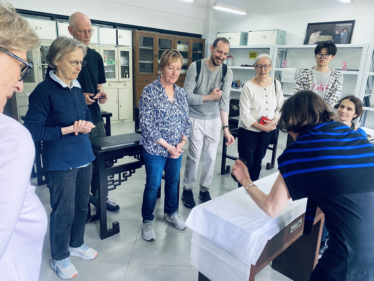 金石传拓技艺课上,王飞(左二)向瑞士学院介绍传拓技艺与书法的紧密关系,记者 孙良摄。