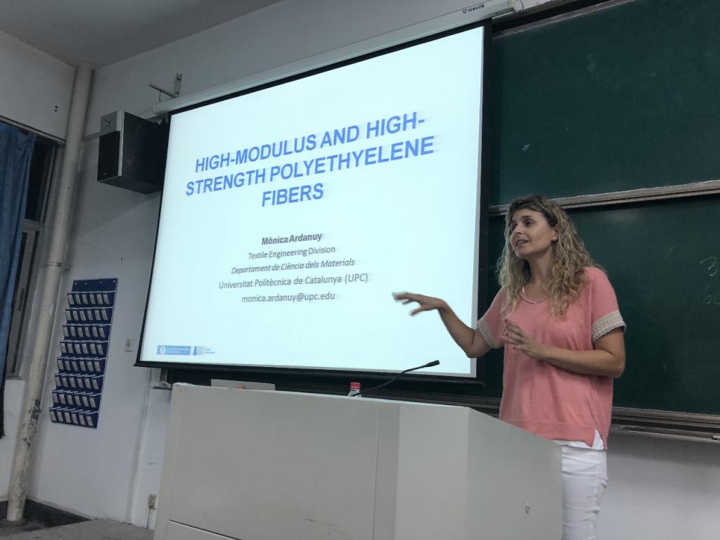 Monica Ardanuy教授为我校纺织服装学院纺工17级学生讲授了《高技术纤维》课程。授课之余,Monica Ardanuy教授在纺织服装学院负责人及部分专业老师的陪同下,参观了学院针织、机织实验室和教师的部分作品,走访了周边专业市场和大型企业。