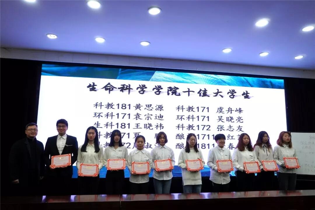会上,今年参加各项赛事取得标志性成果的项目代表进行了项目参赛情况汇报和心路历程分享。会上还进行了生命科学学院国家奖学金获得者情况介绍和2019年度学院论文发表、科研立项、专利授权数据以及2019届研究生录取情况统计汇报,并对班级风采展示大赛、教具制作大赛等进行了颁奖及表彰。
