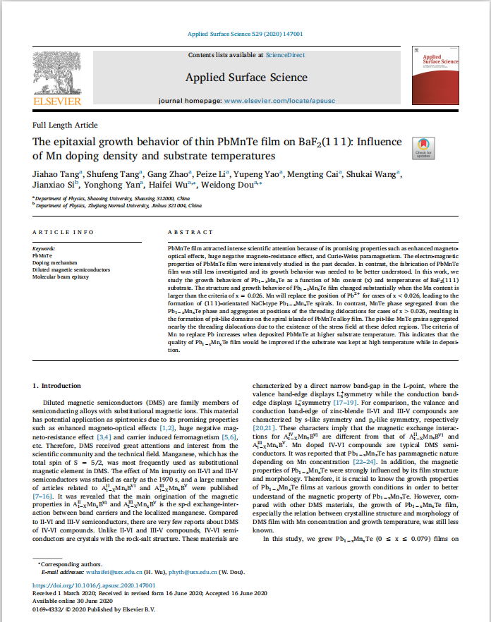 近日,数理信息学院微电子科学与工程161班唐家豪同学以第一作者在SCI 2区收录期刊《Applied Surface Science》(影响因子为6.182)发表学术论文《The epitaxial growth behavior of thin PbMnTe film on BaF2(1 1 1): Influence of Mn doping density and substrate temperatures》。该文阐述了Mn掺杂对PbTe薄膜形貌和结构的影响机理,是该院吴海飞副教授和窦卫东教授主持的国家自然科学基金“表面覆盖Mn纳米岛p型Pb1-xMnxTe薄膜的外延生长及热电性质研究”的阶段性成果之一,吴海飞副教授和窦卫东教授为本文通讯作者。