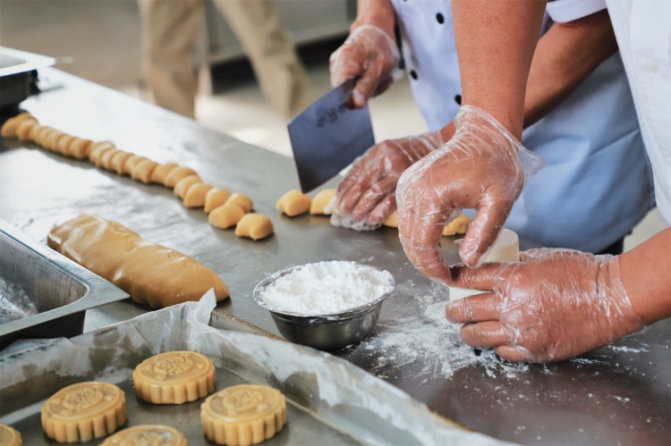 后厨的桌子上,与糖浆混合揉好的面团经过一两个小时的醒发,变得金黄柔软。元培学院兴越楼餐厅的师傅接过面团,揉成长条,切成一块一块大小匀称的小剂子。拿起一块剂子,阿姨灵巧的双手往面团中间一按,四指来回捏动边缘,一只小碗形状的饼皮出现了。“碗”里要装的,当然是提前准备好分成小块的月饼馅了。裹好馅的饼皮在阿姨手上滚动一圈,成了一只圆球。一个个裹好馅的面团相继过模具,一只只成型的月饼跃然眼前。