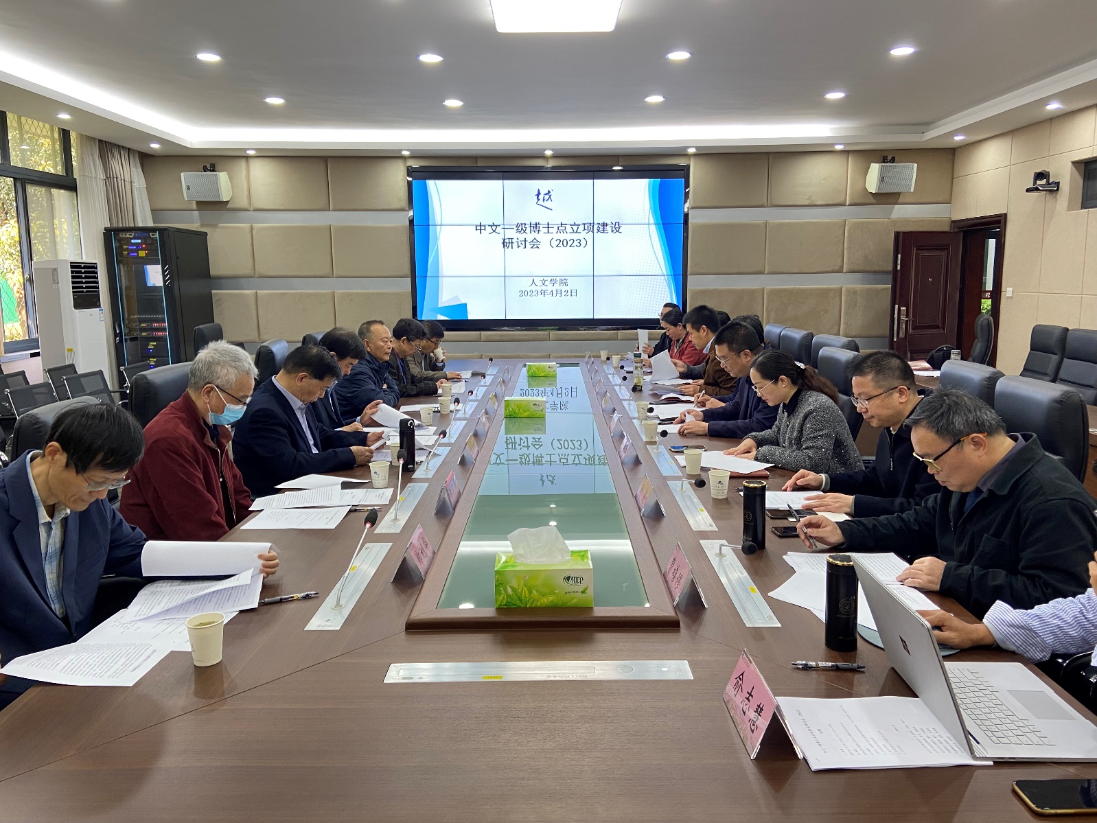 4月2日上午,人文学院召开博士点建设研讨会,进一步做好中国语言文学一级学科博士点立项建设工作。北京外国语大学詹福瑞教授,首都师范大学左东岭教授、黄灵庚教授,中华书局周绚隆总编,中国人民大学徐正英教授,复旦大学郑利华教授等国内知名专家学者来校指导。副校长陈均土出席会议。科技处副处长(主持工作)寿建昕、人文学院院长李圣华、党委书记钱晓萍、人文学院其他班子成员和中国语言文学各二级学科负责人。会议由浙江工业大学教授、我校特聘教授、人文学院学术委员会主任肖瑞峰主持。