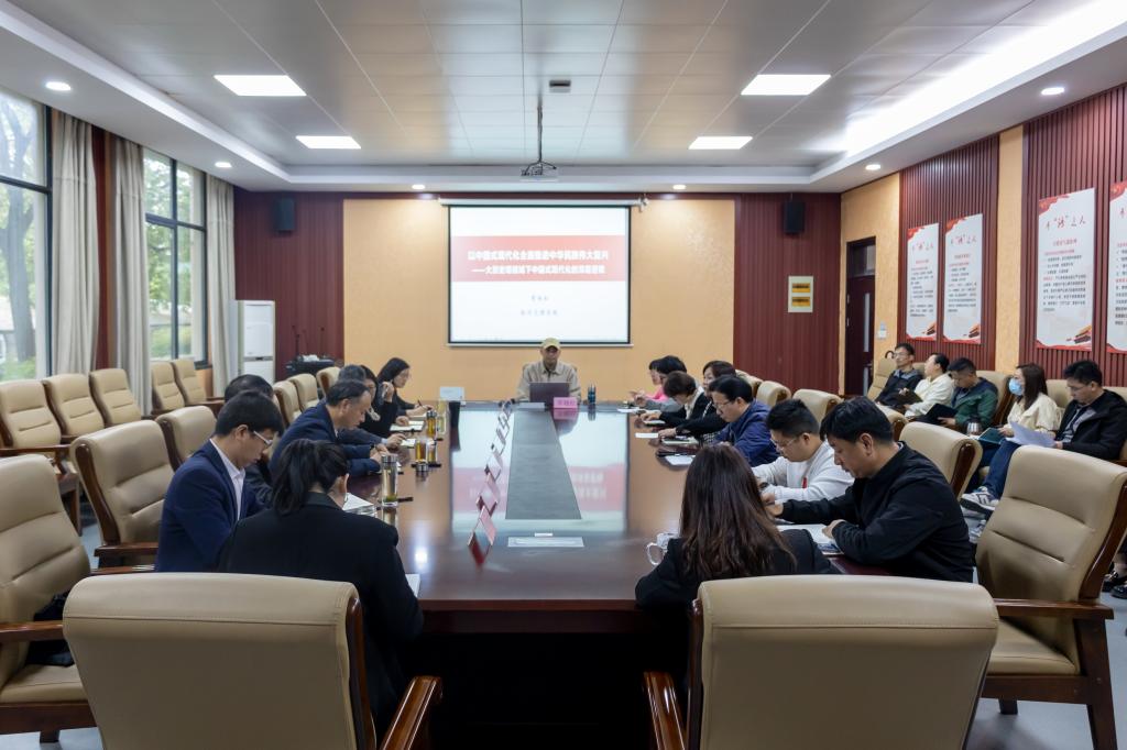 会议邀请校马克思主义学院章越松教授作题为《以中国式现代化全面推进中华民族伟大复兴——大历史观视域下中国式现代化的深层逻辑》专题辅导报告。章越松围绕中华民族伟大复兴与全面建成社会主义现代化强国,从二十大报告逻辑结构、现代化与中国式现代化概念厘定、用社会主义实现中国式现代化、中国式现代化架构等方面进行系统深入的阐述和解读。