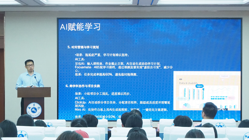 孙良富以“AI重塑职业与学习”为主题,结合自身20年数字化转型经验,解析技术如何颠覆传统职场与教育模式。他提出,AI时代需要“T型人才”——纵向深耕专业能力,横向拓展AI工具应用,强调“AI是杠杆,找准支点才能撬动价值”。互动环节中,学生围绕学习与求职痛点踊跃提问,孙良富提出AI“三用原则”,即辅助思考、验证答案、迭代优化。