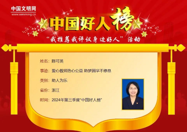 11月12日,2024年第三季度“中国好人榜”发布,我校91届中文(892班)校友陈可英荣获助人为乐类“中国好人”。陈可英为绍兴诸暨市大侣小学教师,11年来,立足本职、聚焦公益,从一名志愿者成长为越民生义工团理事长,先后组织、策划26项公益活动,足迹遍及全市各镇街,用心用情呵护青少年的健康成长。陈可英曾获全国巾帼建功标兵、“浙江好人”等荣誉,其家庭被评为全国文明家庭、全国五好家庭。