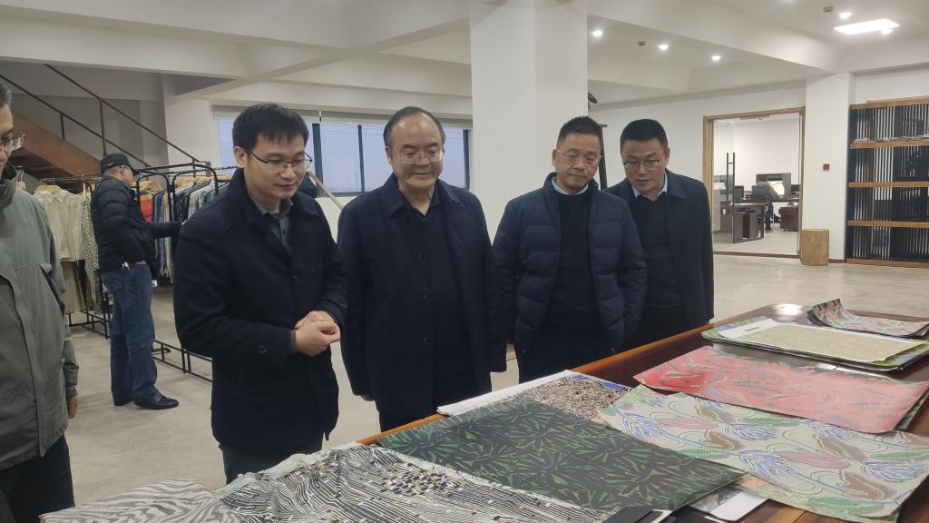 在企业生产车间和产品展示中心,黄坚一行详细听取企业产品研发、市场开拓、技术创新等介绍,观看数码印花图案、布料图案,了解花式设计图案和成衣产品国外销售情况。