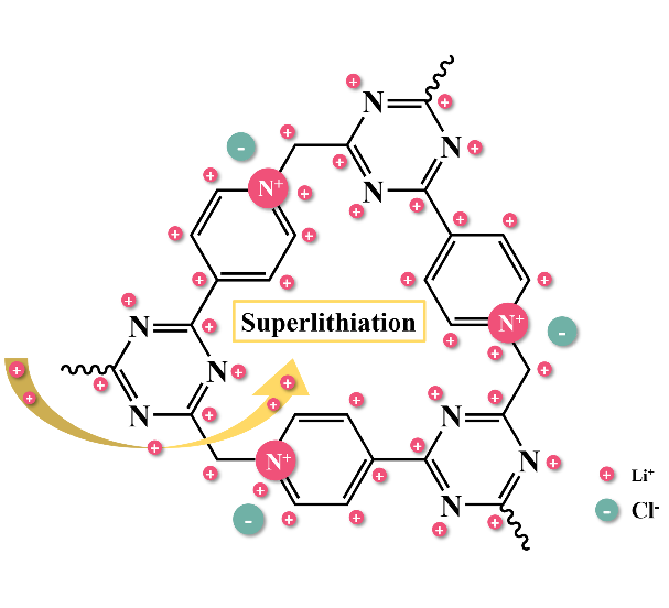 本研究报道了一种吡啶基聚离子液体(PILs-Py)作为锂离子电池负极材料的应用研究,并探讨其储锂机制。以一种含有氰基的吡啶基离子液体(ILs-Py)为单体,ILs-Py在400摄氏度下发生聚合反应生成一种具有规则的分子孔结构的PILs-Py。PILs-Py负极在0.1 A g-1的电流密度下获得了高达1694 mAh g-1的放电比容量。储锂机制表明:在嵌锂过程中,N和C分别与Li形成N-Li键和C-Li键而储锂,材料实现了Li6(C/N)6的超锂化结构,可以说该研究成果已经到达有机聚合物的储锂极限。与先前聚合物相比,PILs-Py的优势在于聚合物主链不仅可以通过链段运动改善Li+的迁移动力学,同时含有吡啶鎓的带电结构与Li+之间的静电互斥作用加速其扩散速率,使Li+更快地到达储锂位点,充分发挥材料的储锂潜能。