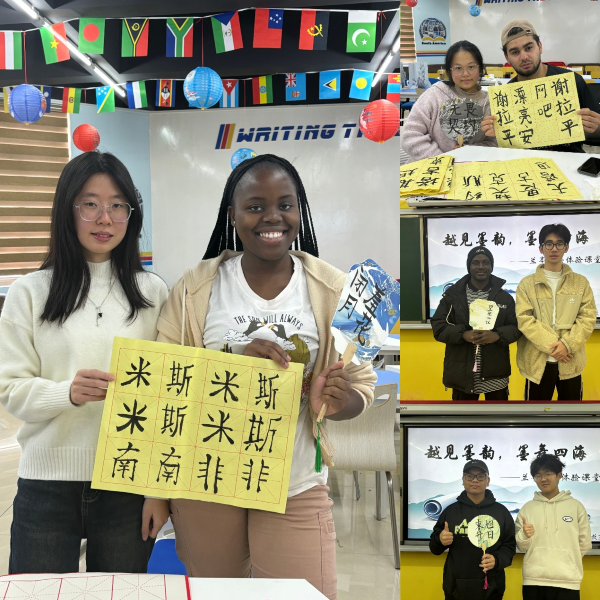 11月30日,外国语学院“越见墨韵,墨舞四海”学生团队与校内留学生一起开展了书法课堂实践活动。